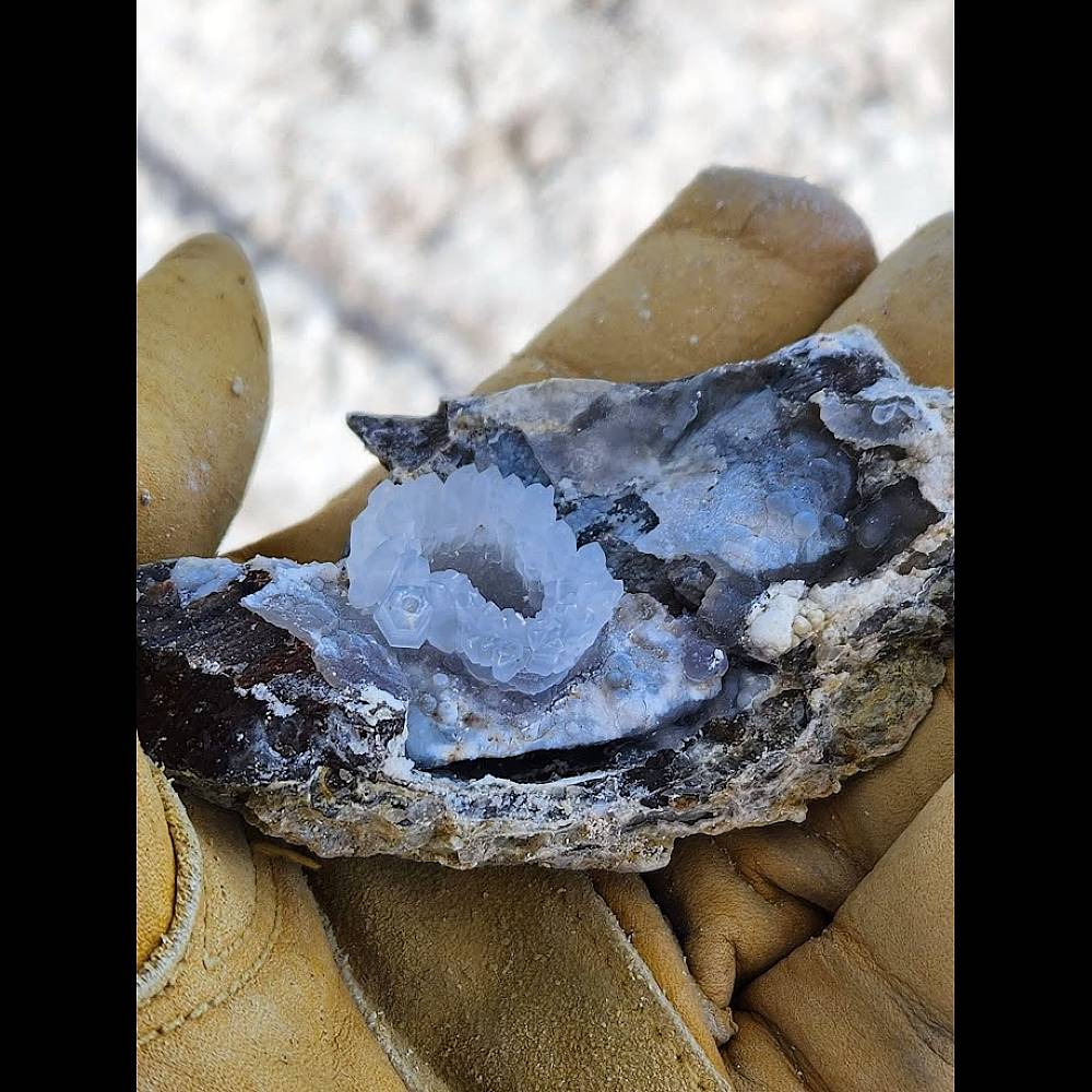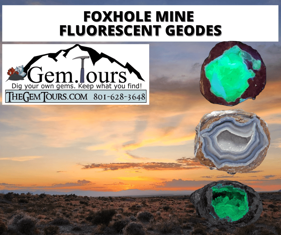 Geodes from the Foxhole Mine may contain banded agate, druzy quartz, and spectacular quartz crystal formations, including quartz β€œflowers” similar to those found at the famous Dugway Geode Beds. Many specimens exhibit fluorescence under UV light, adding an extra layer of excitement to every find.